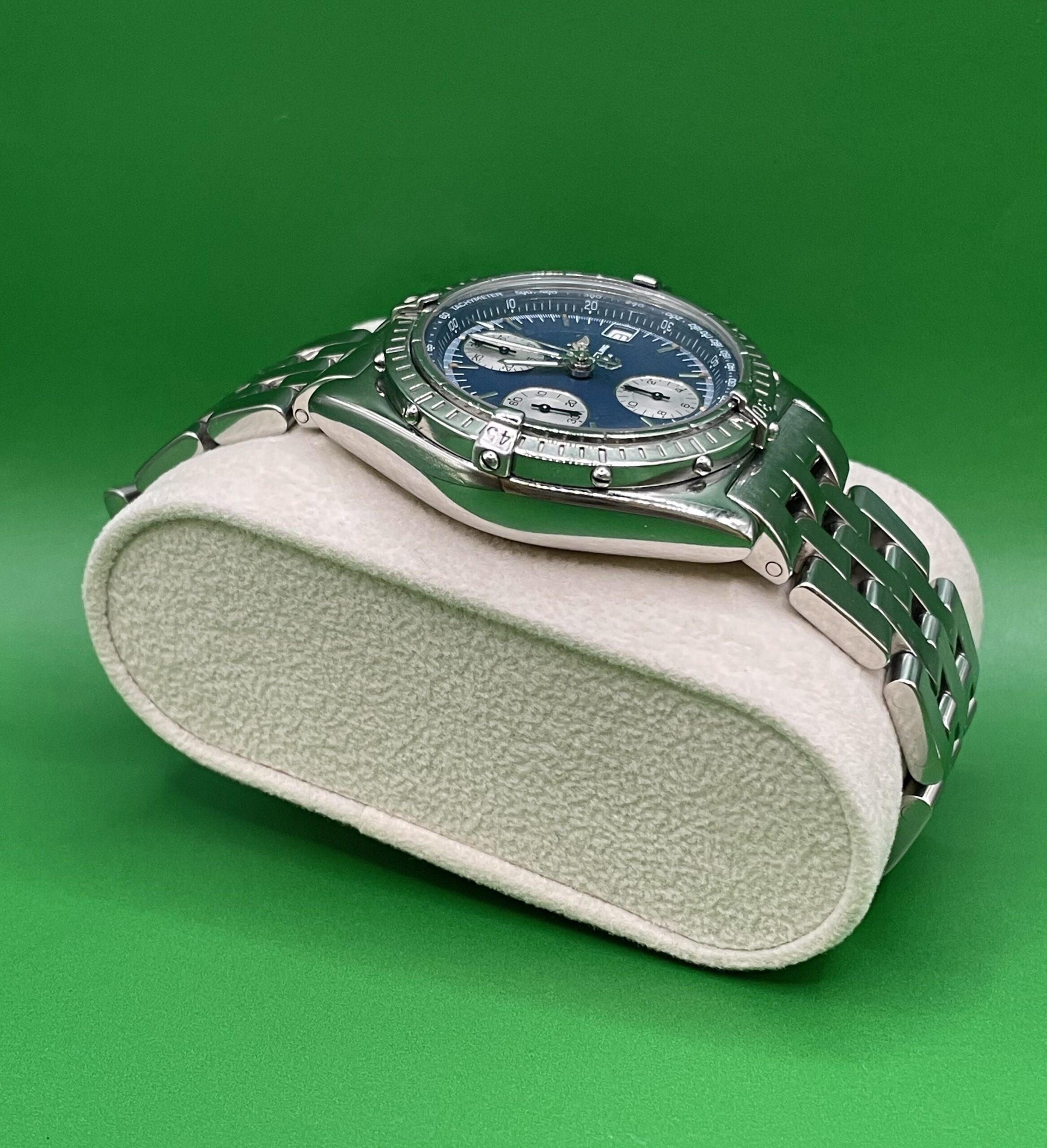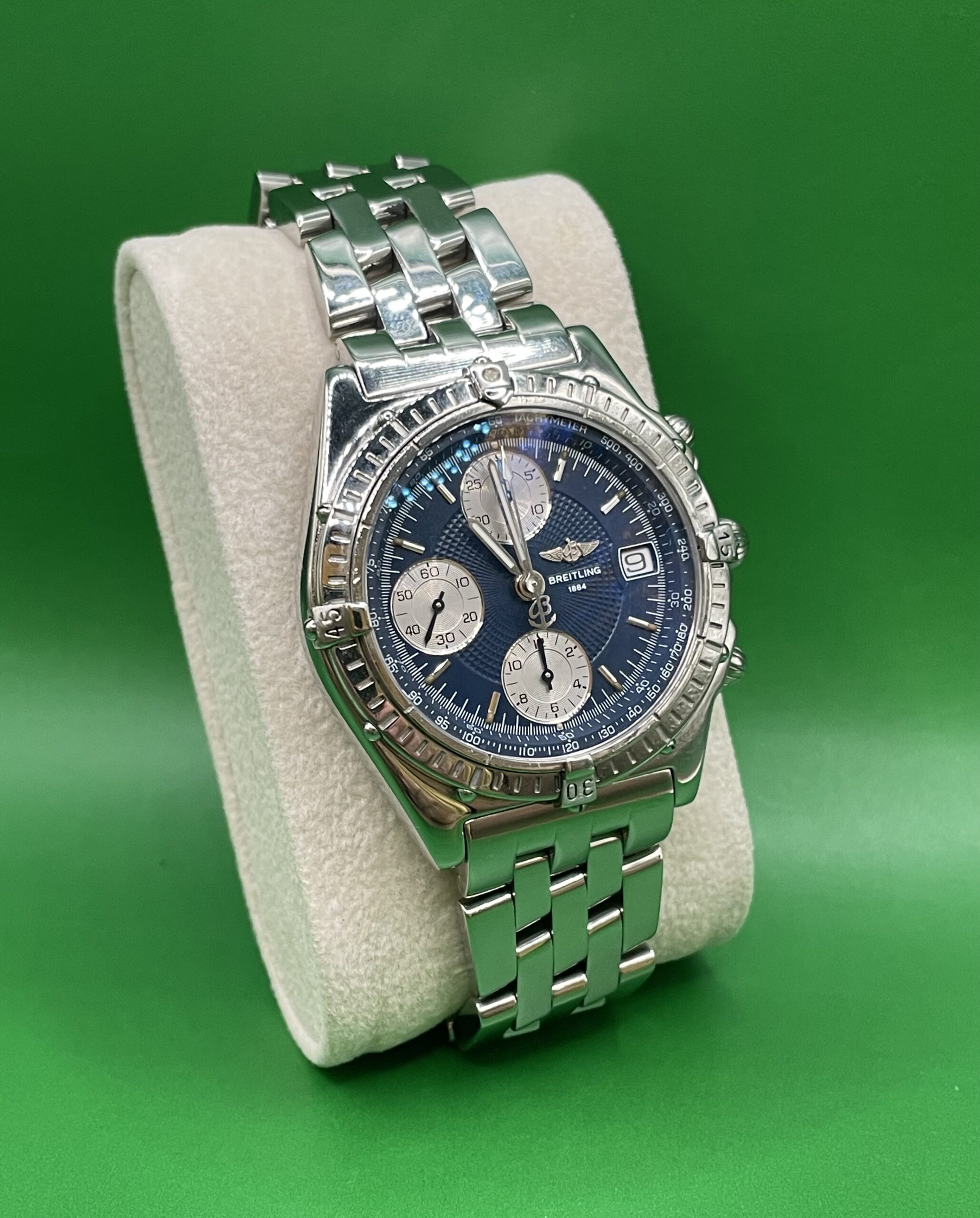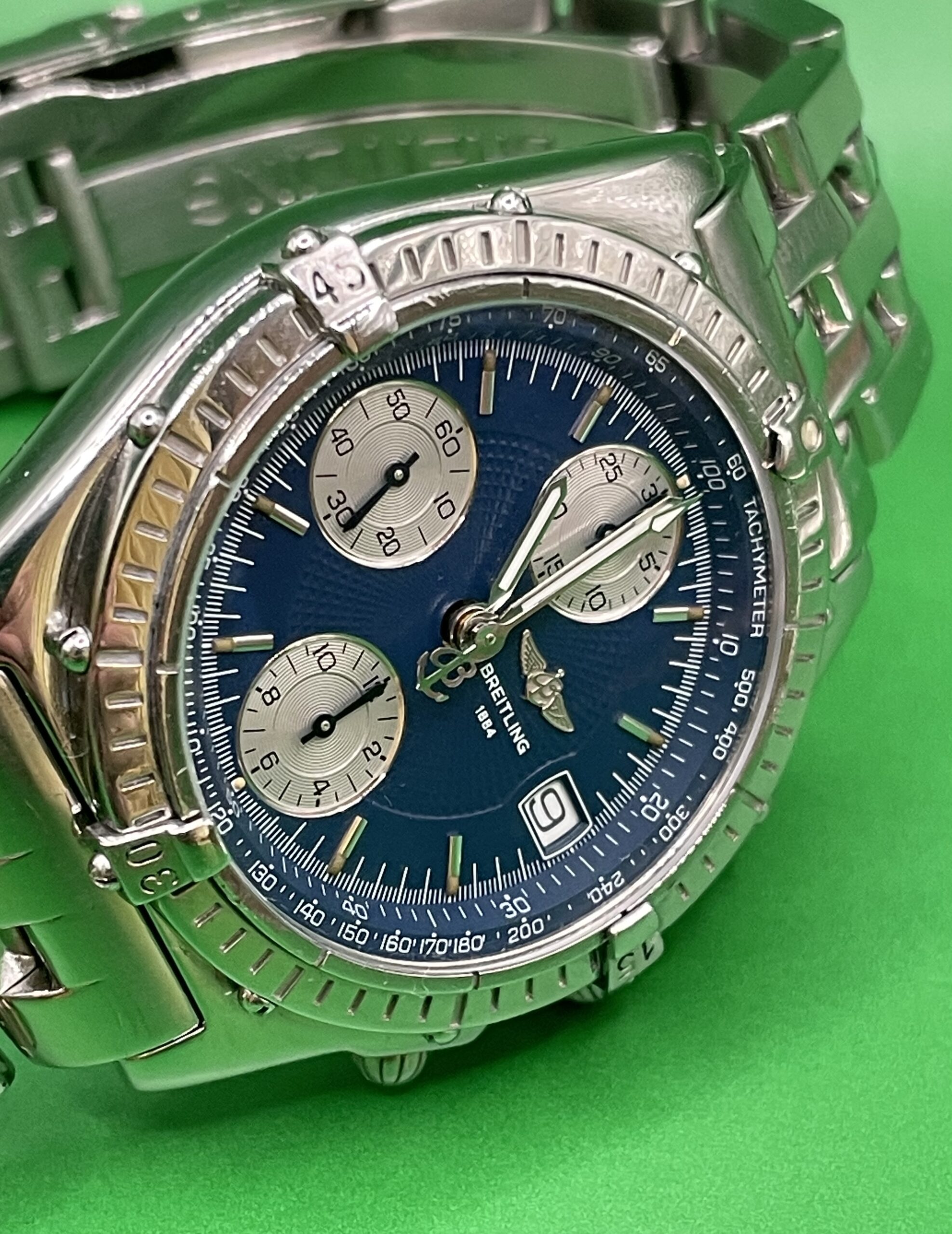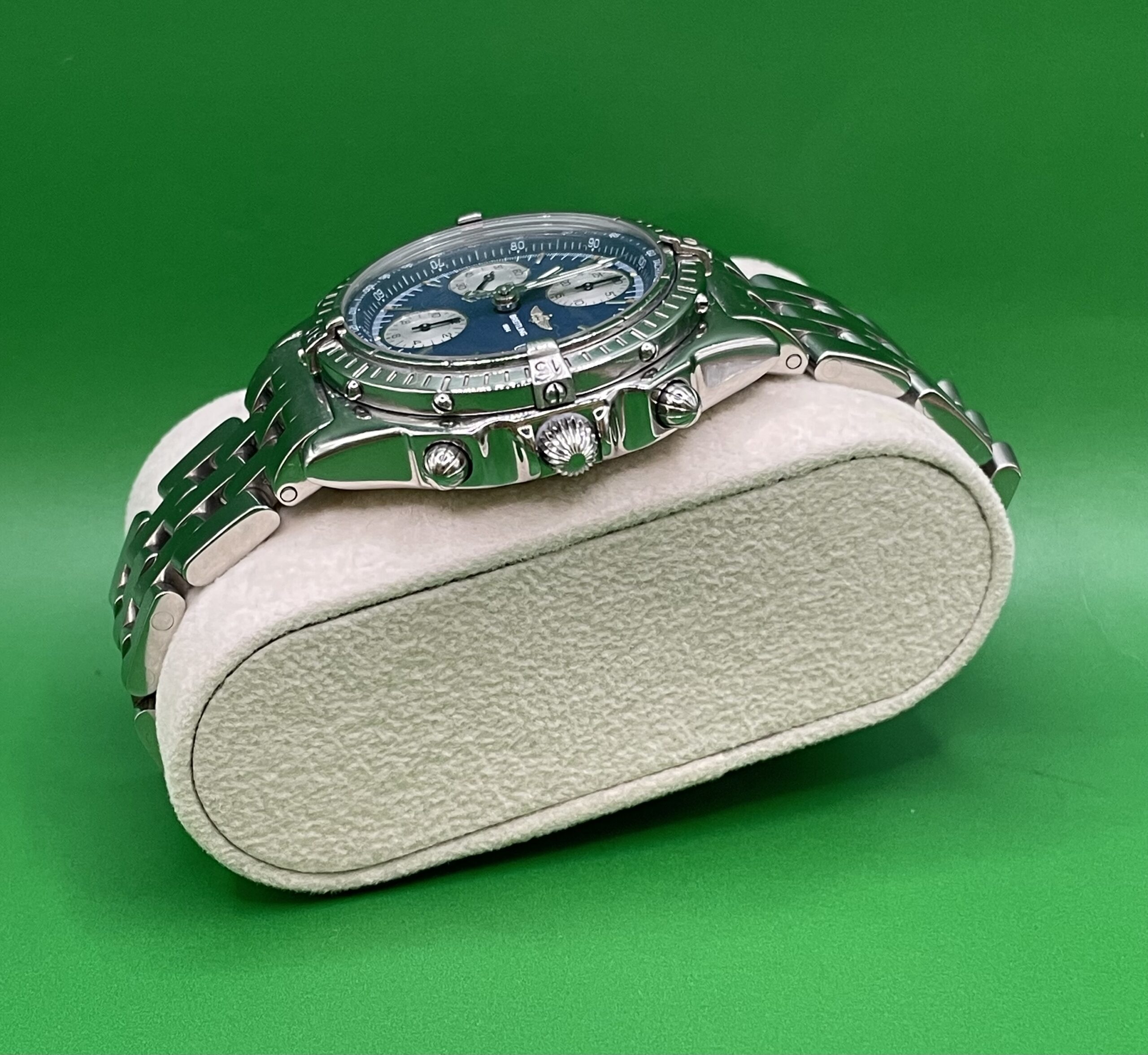 Zifferblatt: Original Breitling blau. Gehäusezustand: A 13050.1-Abdeckung. Glaszustand: Saphir gebraucht