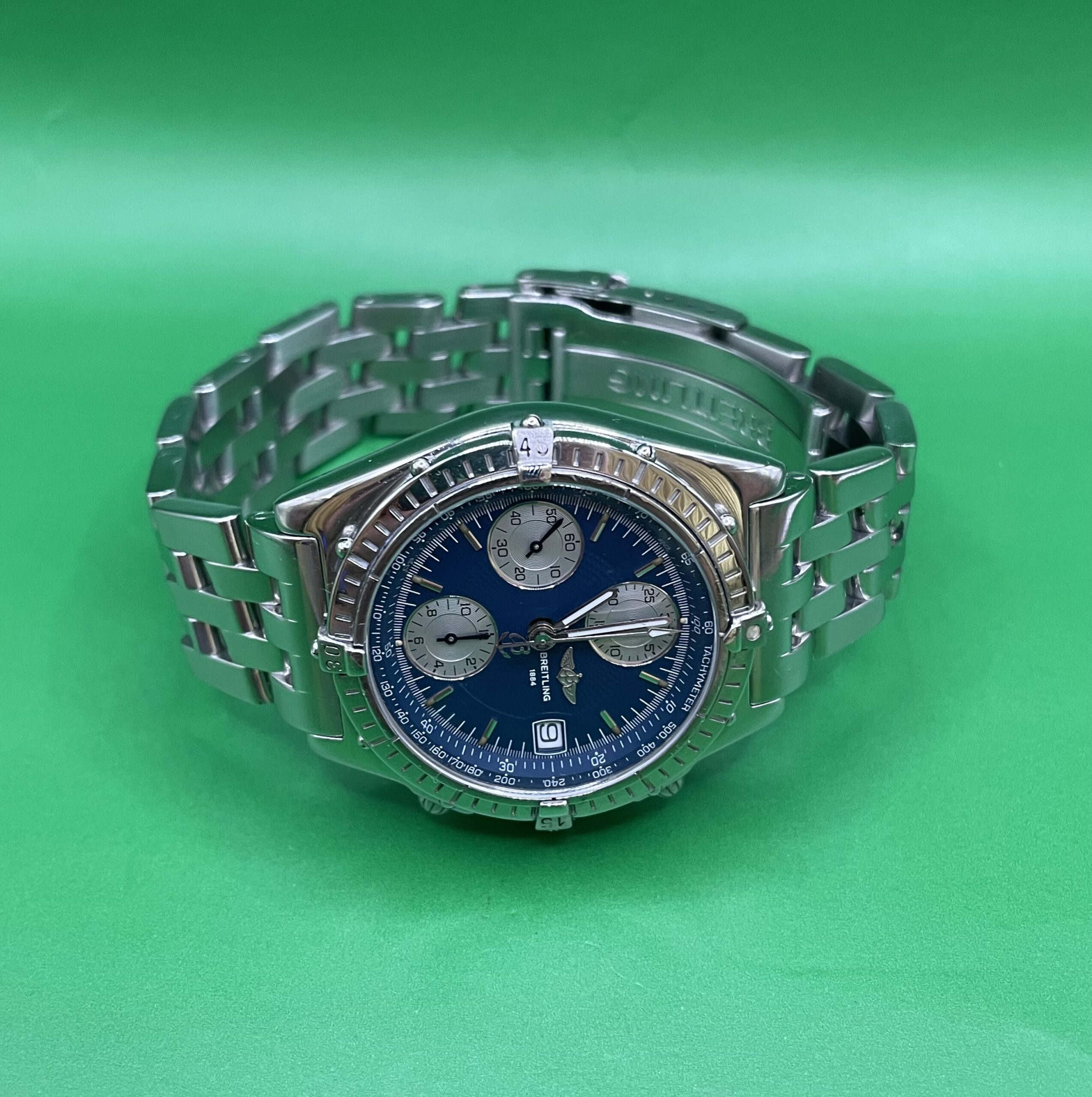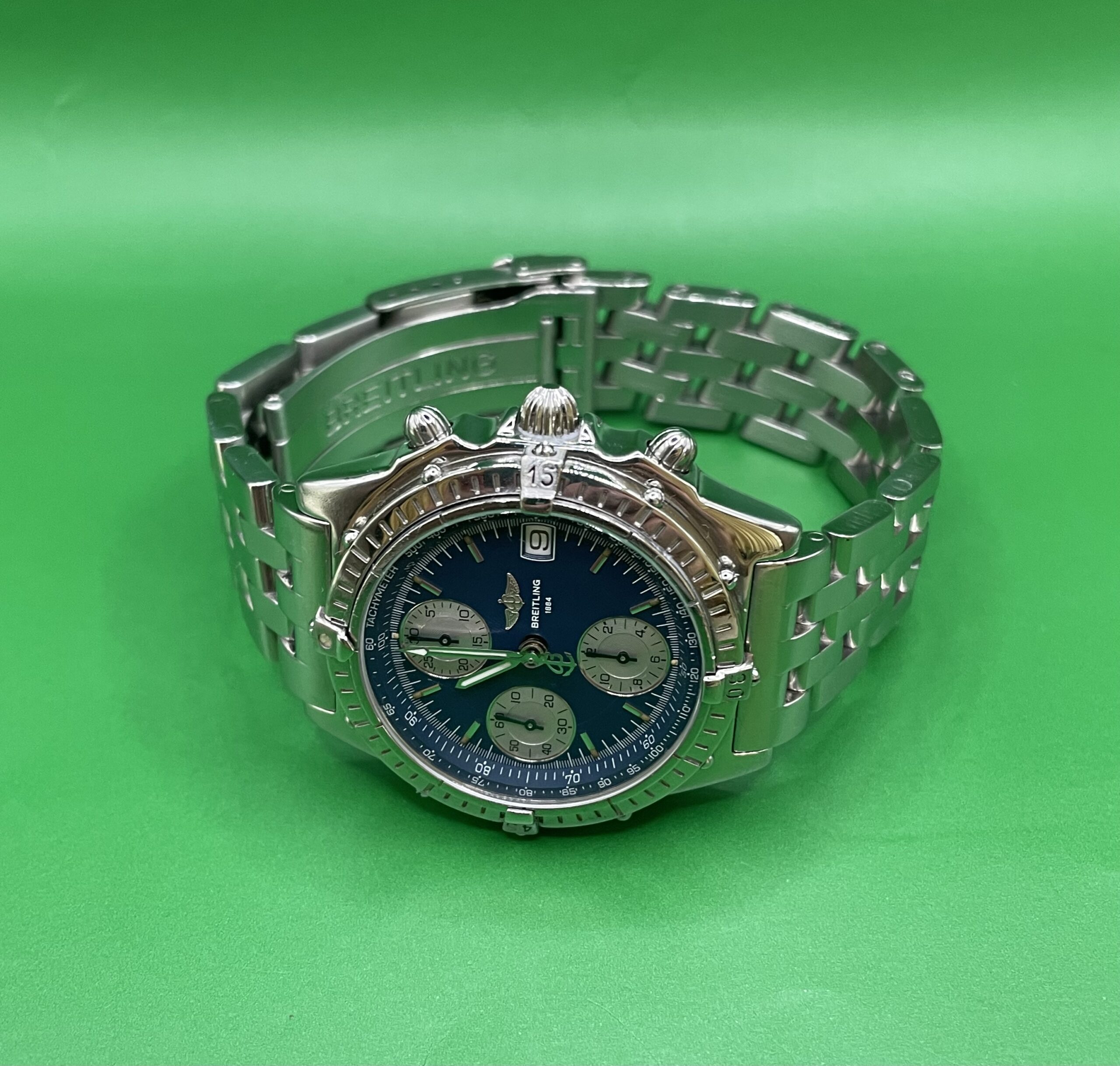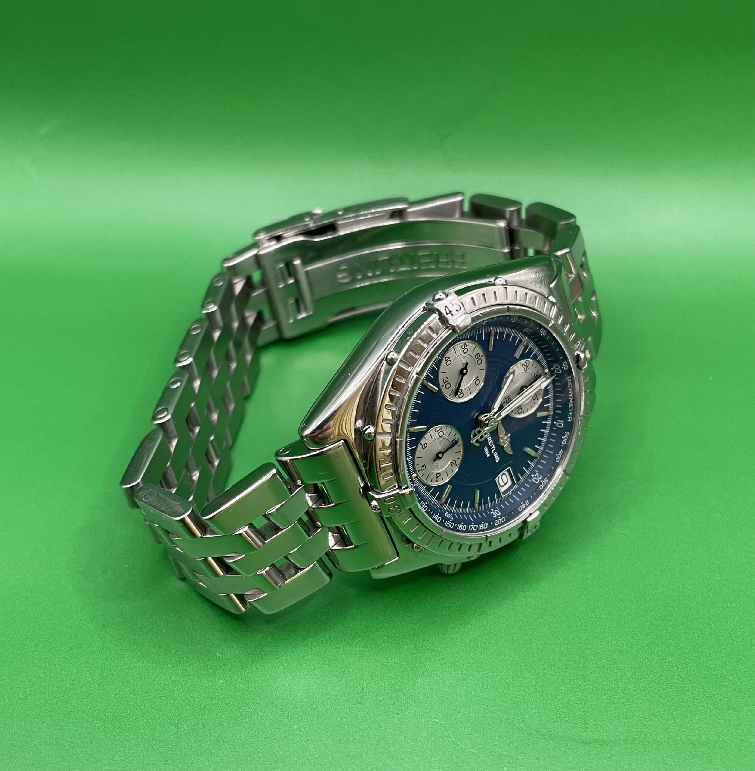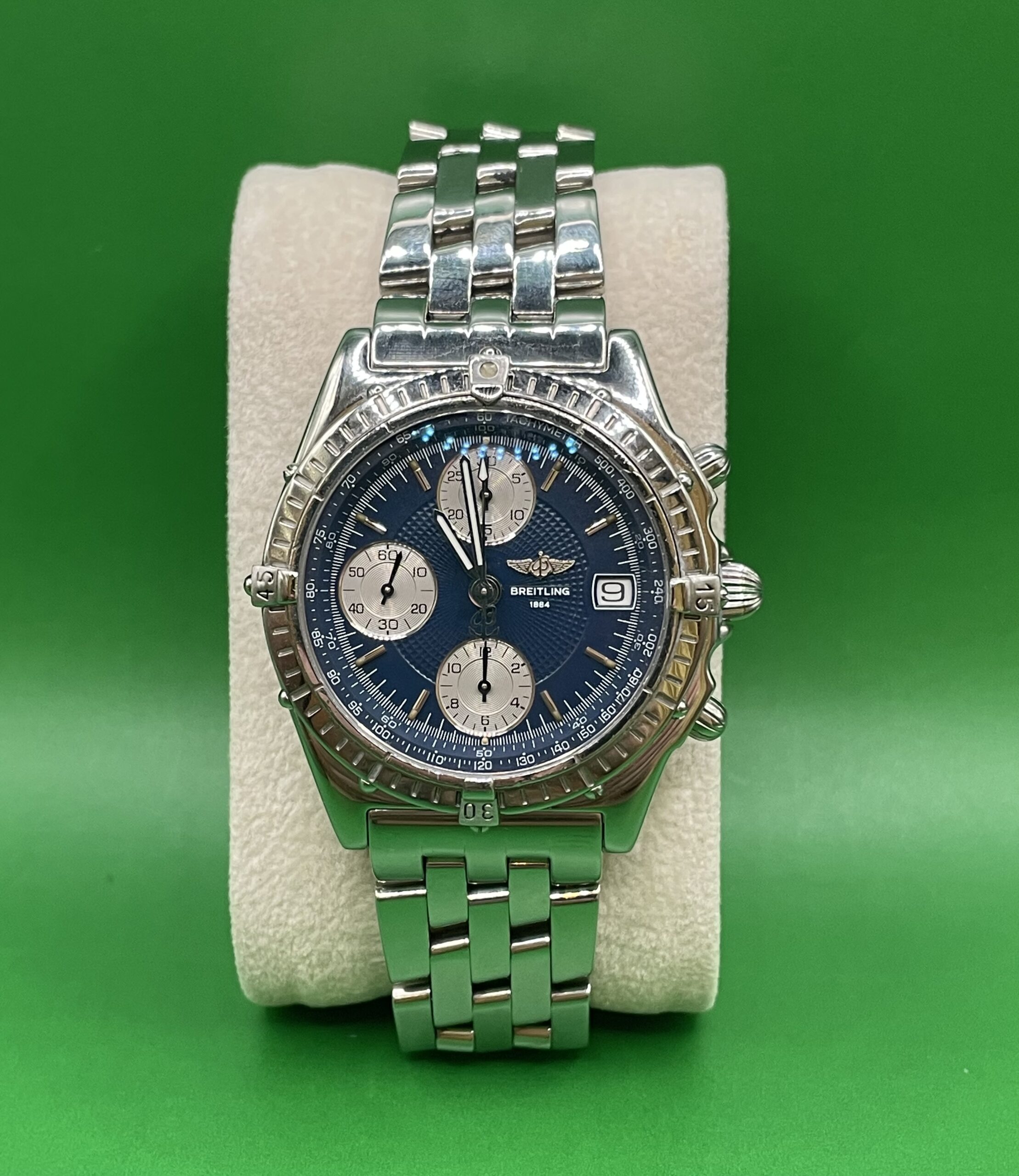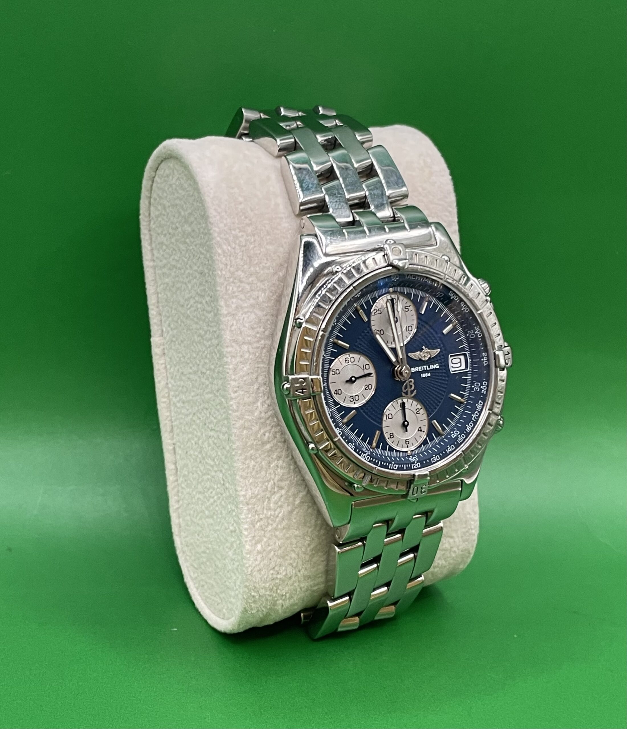 Zifferblatt: Original Breitling blau. Gehäusezustand: A 13050.1-Abdeckung. Glaszustand: Saphir gebraucht